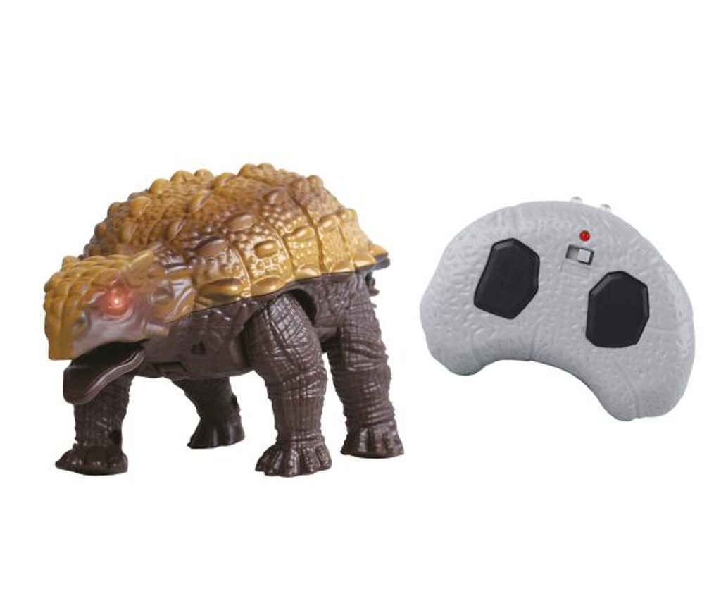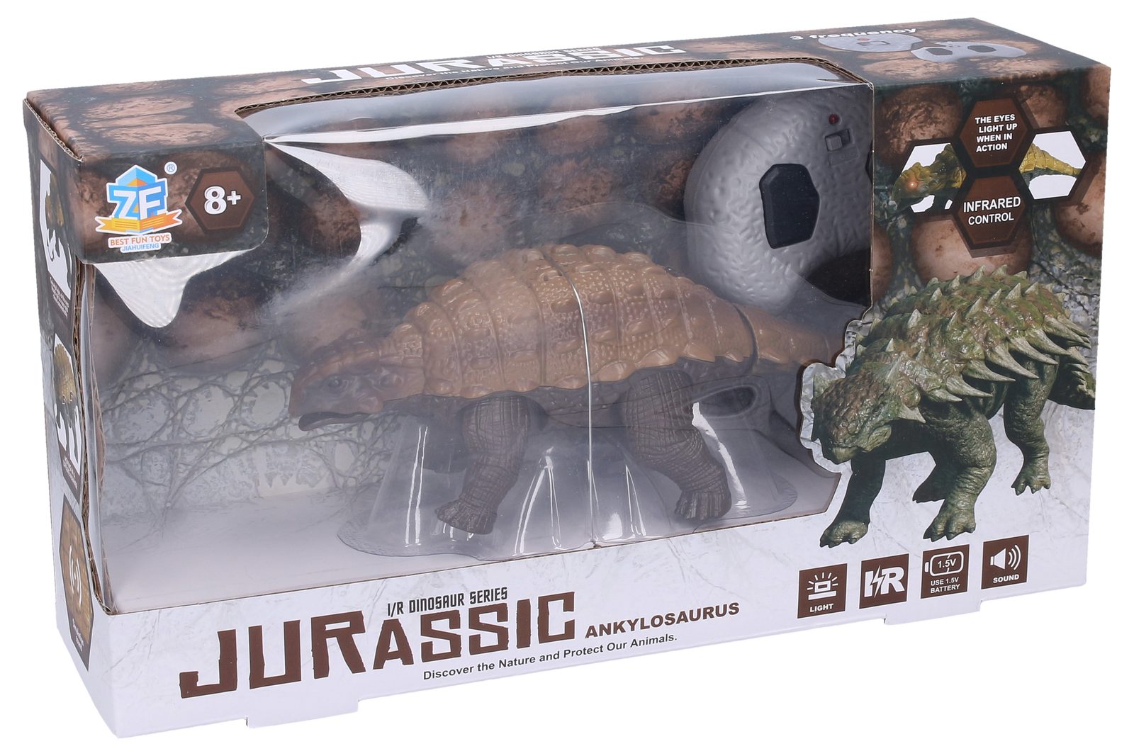 Dino Ankylosaurus RC la telecomandă. Dimensiune 24 x 11 x 8 cm. Controlerul IR. Strălucind ochii și bot de deschidere. Mișcare înainte și înapoi. Selectarea a 3 frecvențe (A, B, C).
